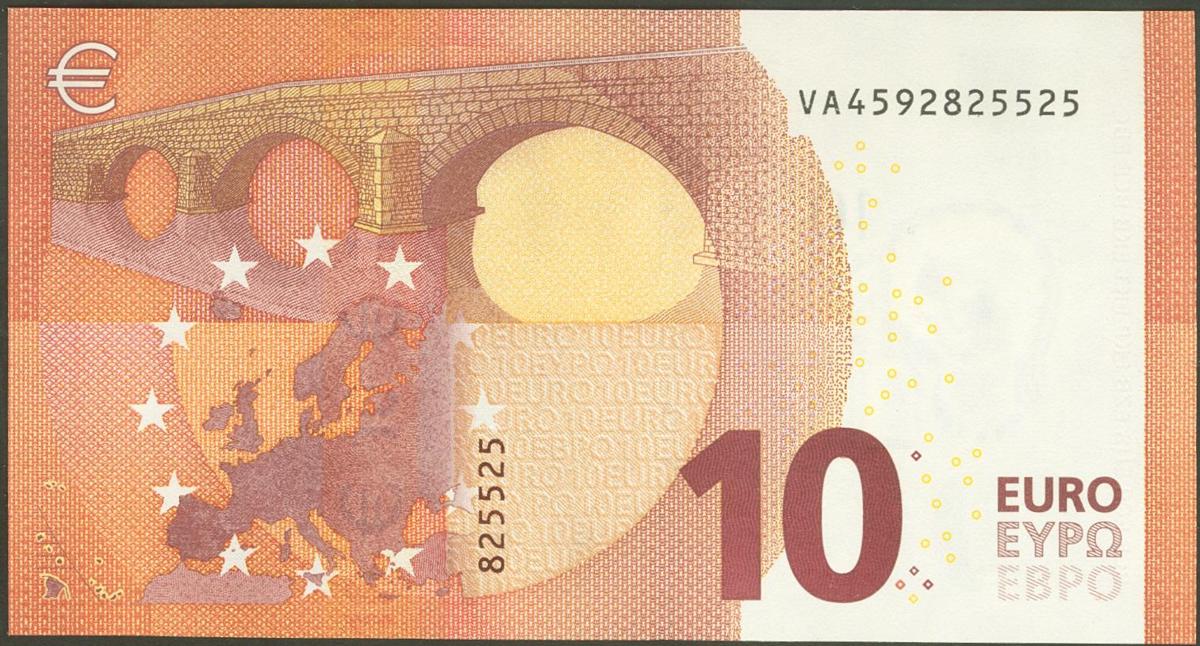 10 Euros. 23 de Septiembre de 2014. Firma Draghi. Serie V (España). (Edifil 2021: 494). Ondulación natural del proceso de fabricación (este es el único motivo de "quitarle" el SC). EBC+++.