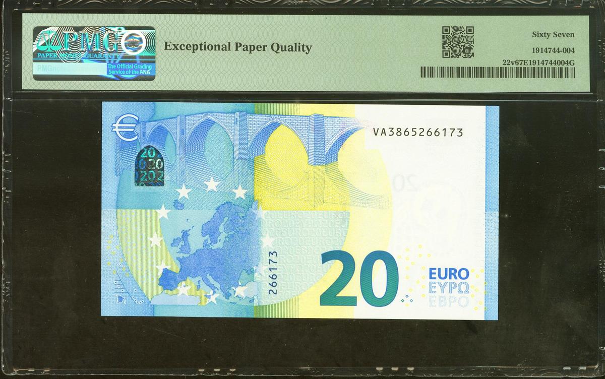20 Euros. 25 de Noviembre de 2015. Firma Draghi. Serie V (España). (Edifil 2021: 495, Pick: 22v). SC. Encapsulado PMG67EPQ.