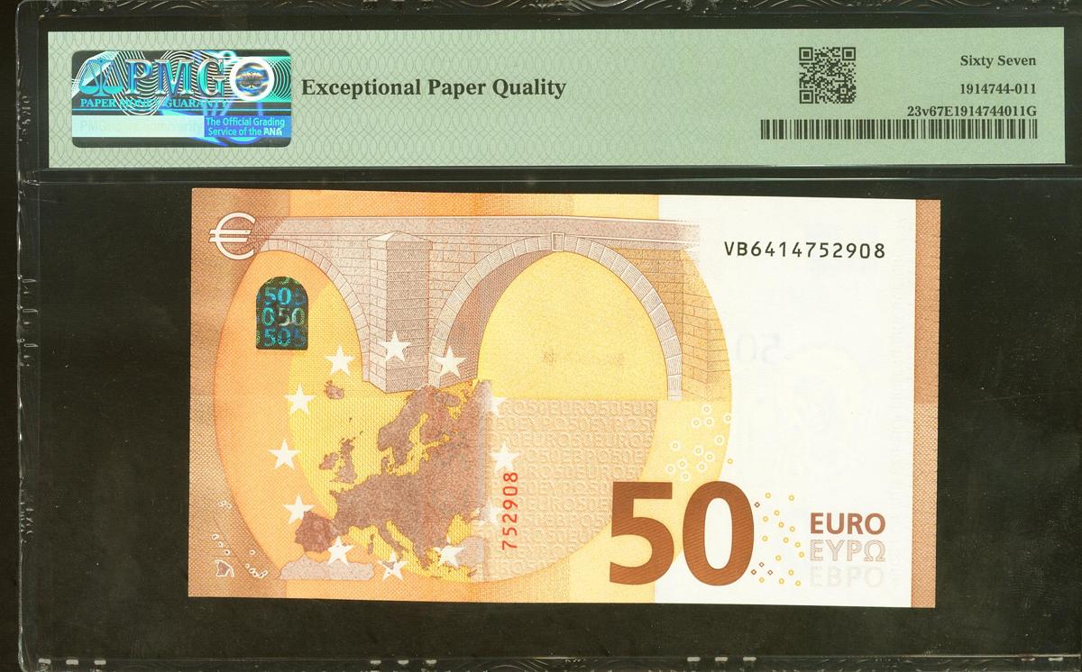 50 Euros. 4 de Abril de 2017. Firma Draghi. Serie V (España). (Edifil 2021: 496, Pick: 23v). SC. Encapsulado PMG67EPQ.