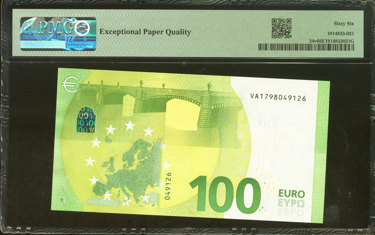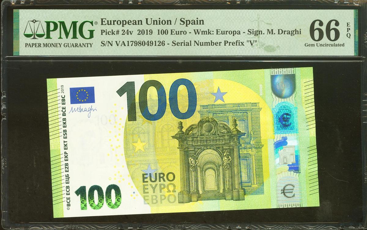 100 Euros. 28 de Mayo de 2019. Firma Draghi. Serie V (España). (Edifil 2021: 497, Pick: 24v). SC. Encapsulado PMG66EPQ.