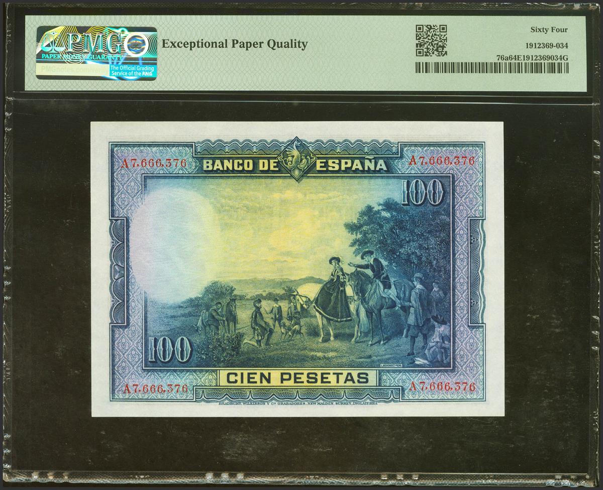 100 Pesetas. 15 de Agosto de 1928. Serie A. (Edifil 2021: 355a, Pick: 76a). Raro en esta calidad, apresto original. SC. Encapsulado PMG64EPQ