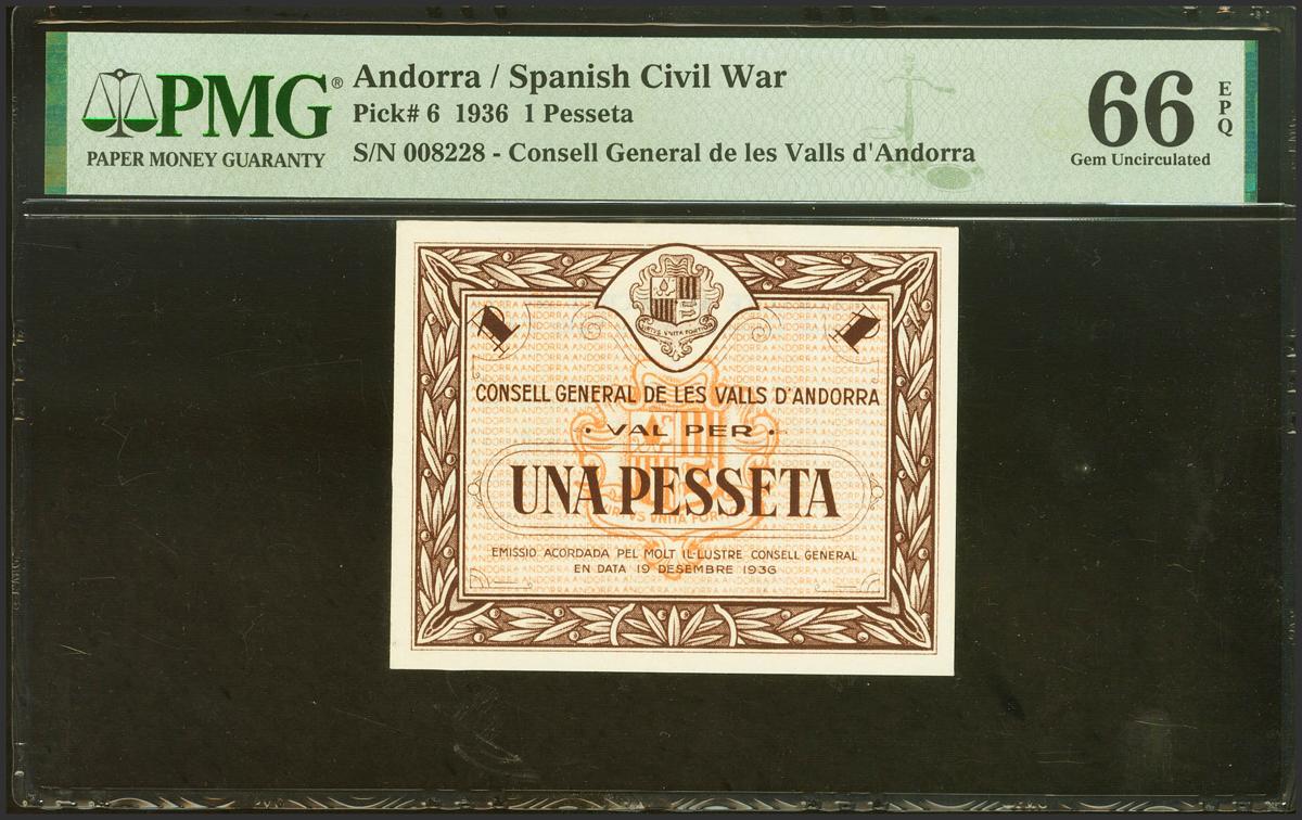ANDORRA. 1 Pesseta. 19 de Diciembre de 1936. Sin serie. (Edifil 2021: 3, Pick: 6). Raro, especialmente en esta excepcional calidad, apresto original. Encapsulado PMG66EPQ.