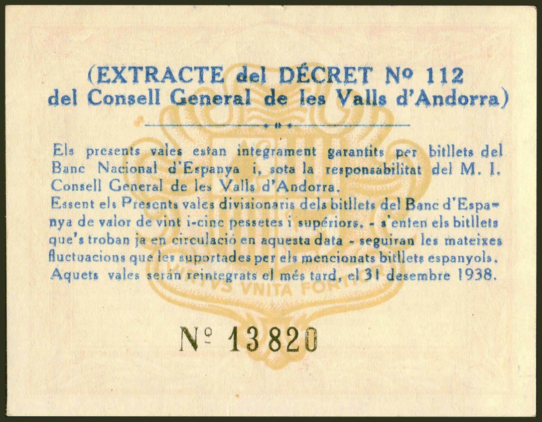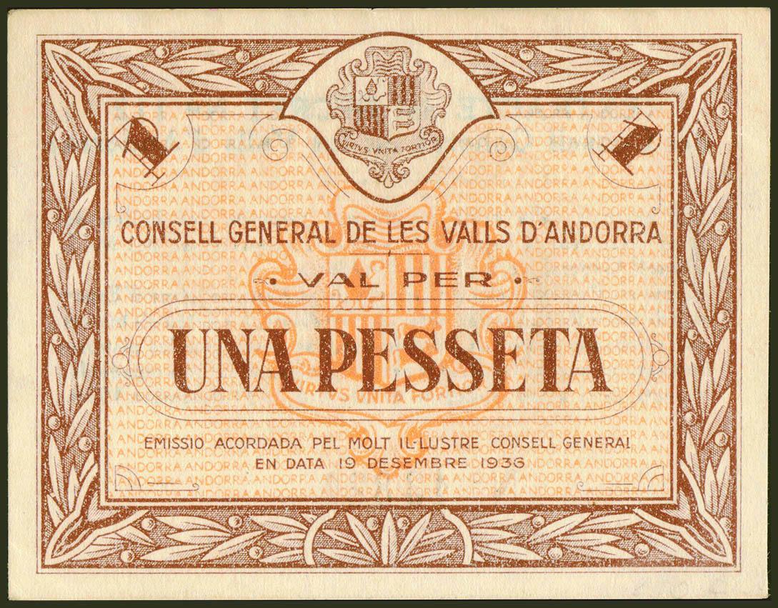 ANDORRA. 1 Pesseta. 19 de Diciembre de 1936. Sin serie. (Edifil 2021: 3). Conserva todo su apresto original. SC-.