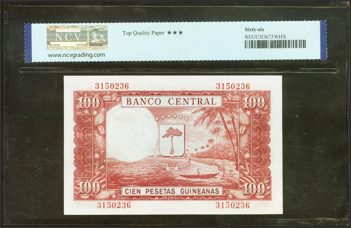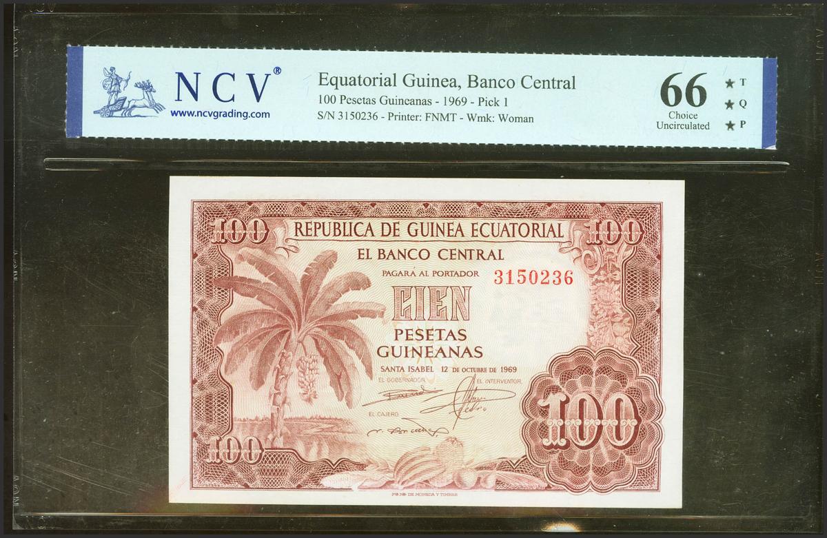 GUINEA ECUATORIAL. 100 Pesetas. 12 de Octubre de 1969. Sin serie. (Pick: 1). Apresto original. SC. Encapsulado NCV66TQP.