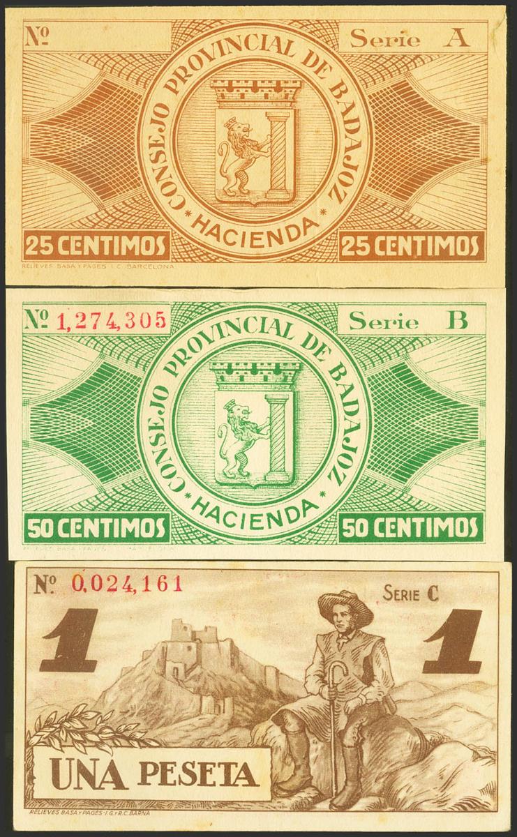 BADAJOZ. 25 Céntimos, 50 Céntimos y 1 Peseta. 1 de Octubre de 1937. Series A, B y C, respectivamente (el 25 Céntimos sin numeración). (González: 834/36). Serie completa. EBC.