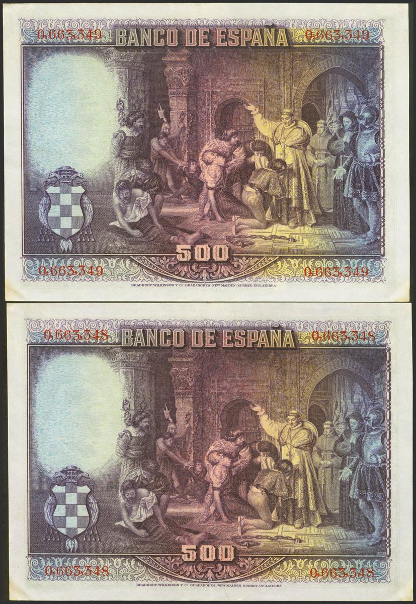 500 Pesetas. 15 de Agosto de 1928. Pareja correlativa. Sin serie. (Edifil 2021: 356). Conserva parte de su apresto original. EBC.