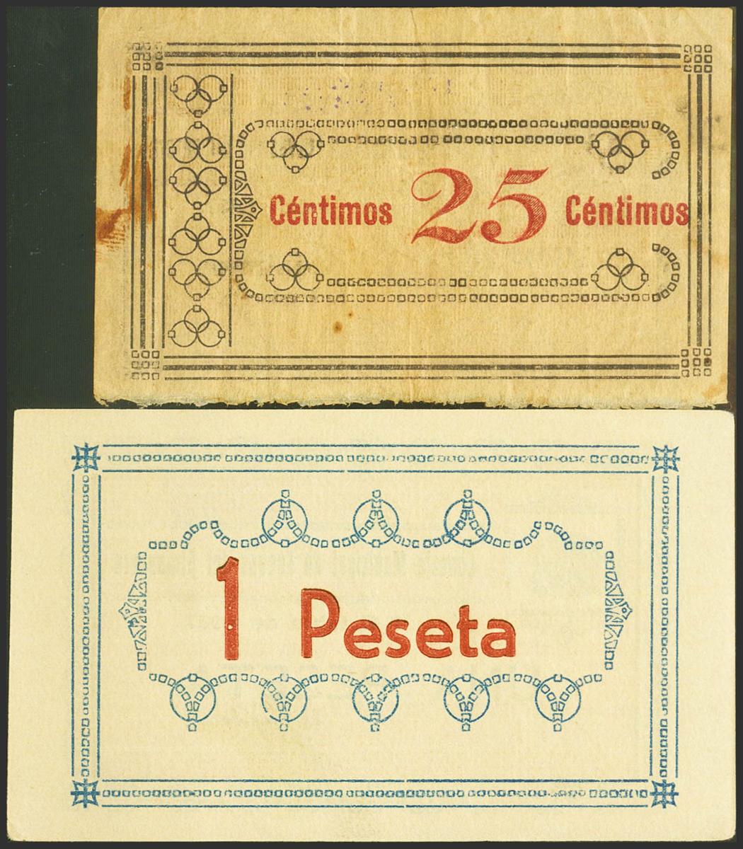 CUEVAS DEL ALMANZORA (ALMERIA). 25 Céntimos y 1 Peseta. 2 de Octubre de 1937. (González: 2140, 2142). Inusuales. MBC-/SC.