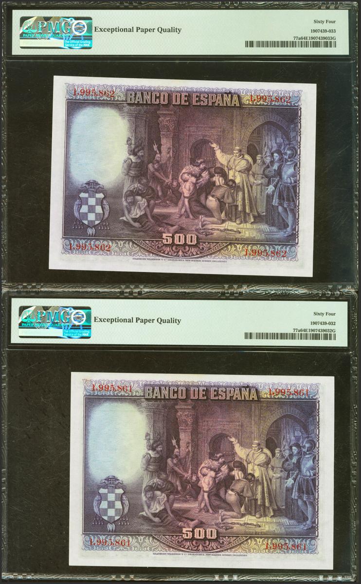 500 Pesetas. 15 de Agosto de 1928. Pareja correlativa. Sin serie. (Edifil 2021: 356, Pick: 77a). Apresto original. SC. Encapsulados PMG64EPQ, ambos.