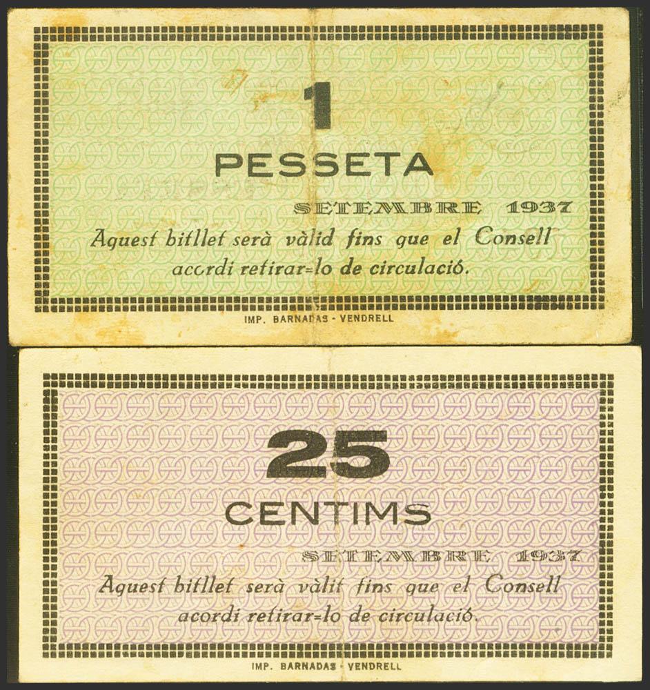 DOMENYS DEL PENEDES (TARRAGONA). 25 Céntimos y 1 Peseta. Septiembre de 1937. (González: 7715/16). Inusual serie completa. MBC+.