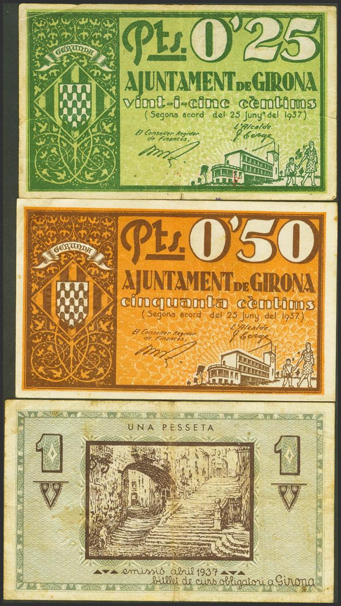 GERONA. 25 Céntimos, 50 Céntimos y 1 Peseta. Abril 1937 y Junio 1937. El 1 pts serie A. (González: 8030, 8031/32). MBC+.
