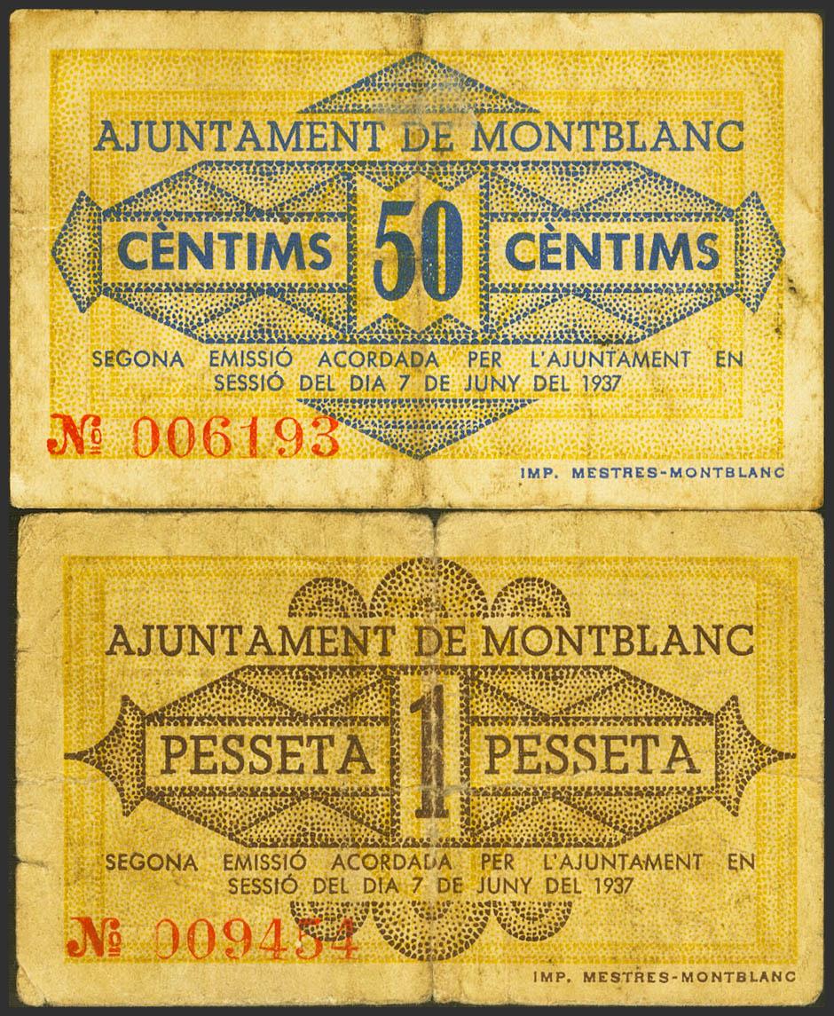 MONTBLANC (TARRAGONA). 50 Céntimos y 1 Peseta. 8 de Junio de 1937. (González: 8749/50). Serie completa. MBC-.