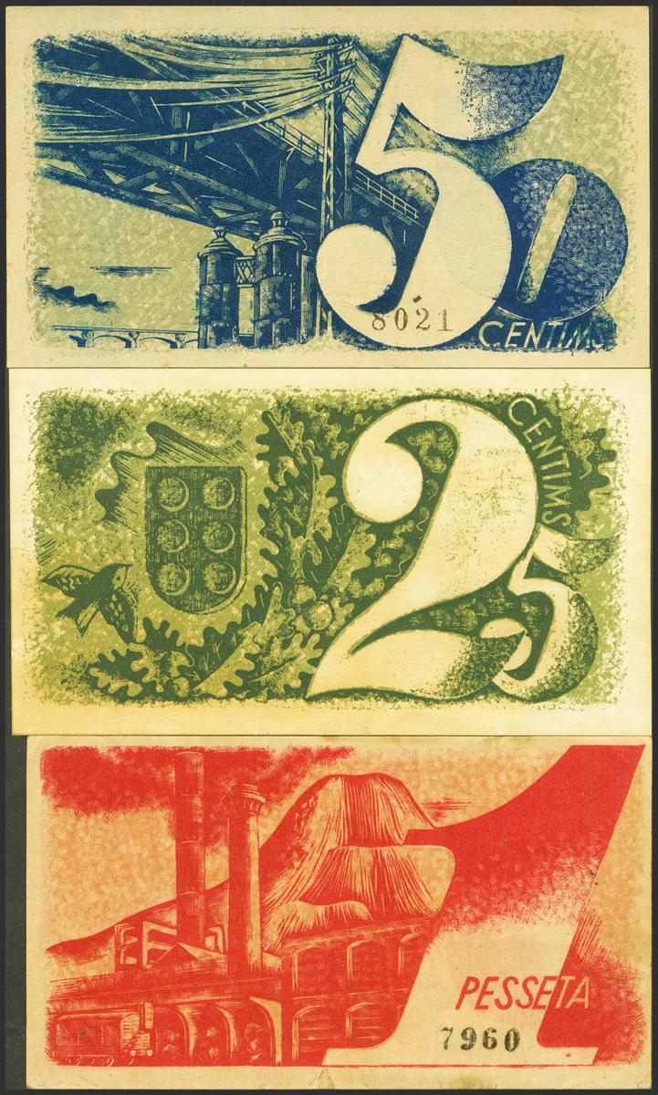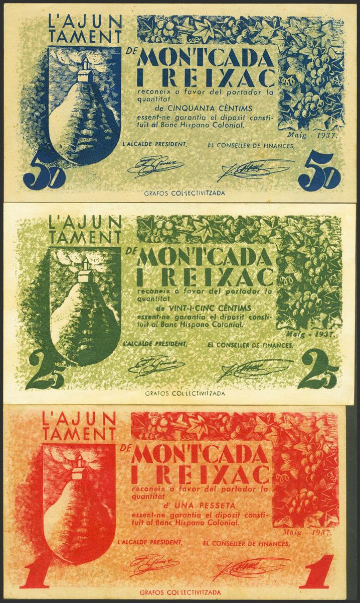 MONTCADA I REIXAC (BARCELONA). 25 Céntimos, 50 Céntimos y 1 Peseta. Mayo 1937. (González: 8773/75). Serie completa. MBC+/SC-.