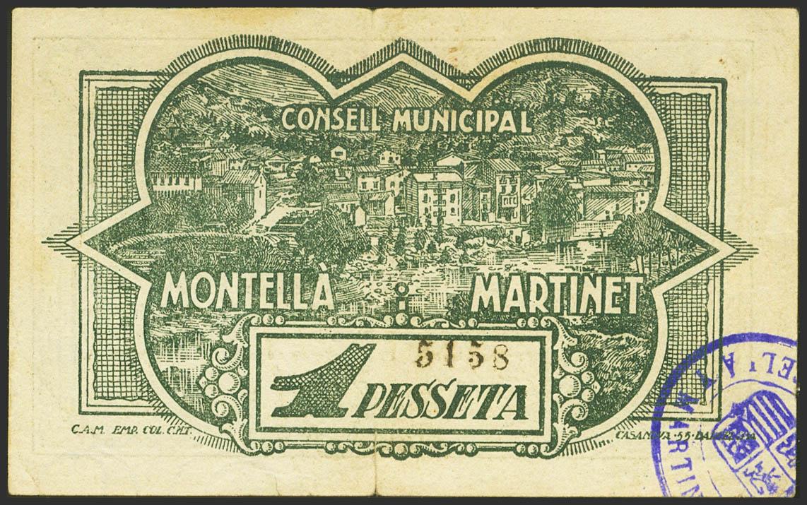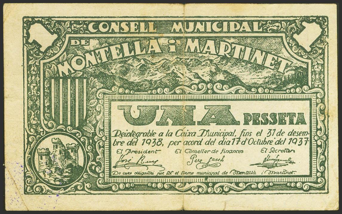 MONTELLA I MARTINET (LERIDA). 1 Peseta. 20 de Abril de 1937. (González: 8783). Raro. MBC.