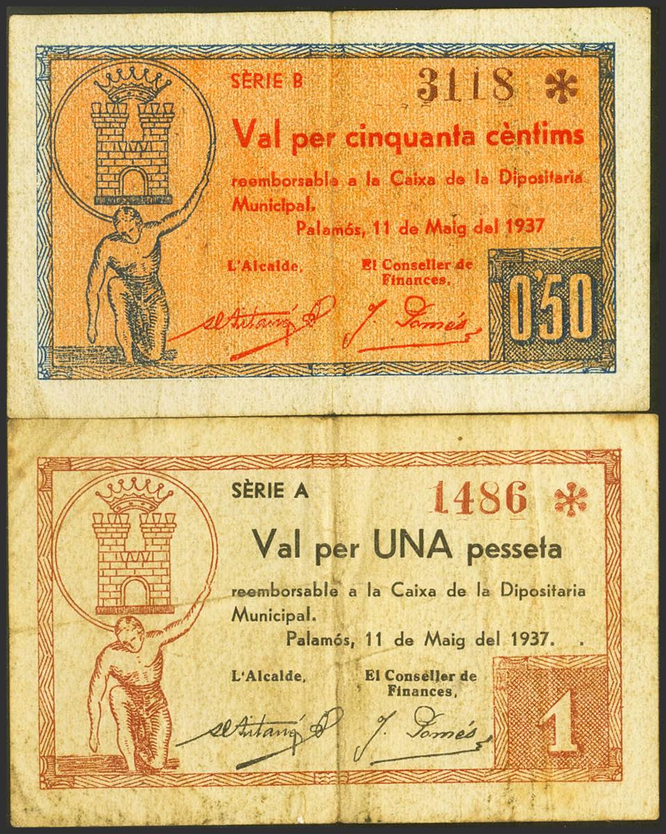 PALAMOS (GERONA). 1 Peseta. 11 de Mayo de 1937. Serie B y A, respectivamente. (González: 9096). Raros. MBC.
