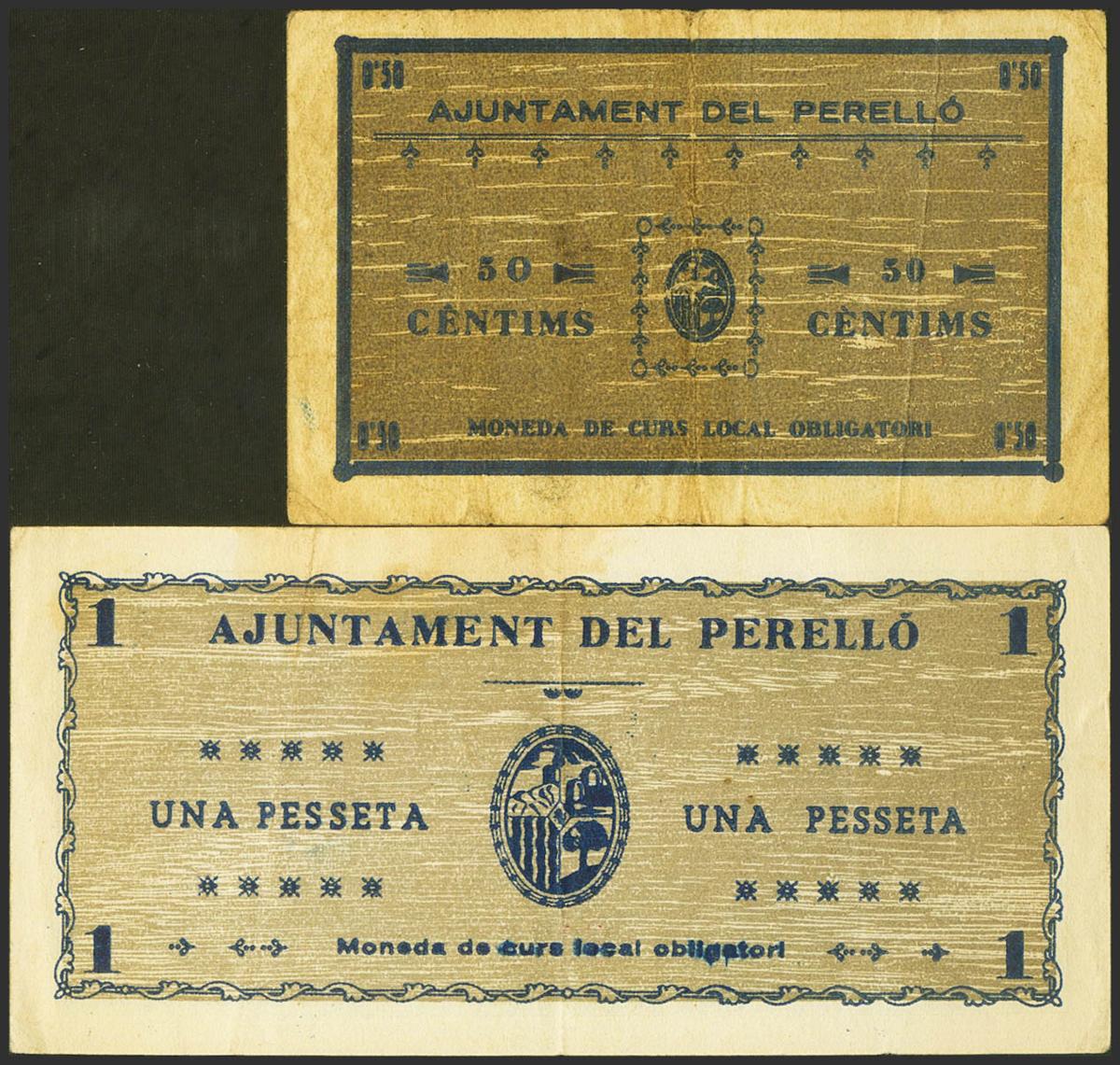 PERELLO (TARRAGONA). 50 Céntimos y 1 Peseta. 6 de Agosto de 1937. (González: 9203/04). Rara serie completa. MBC+.