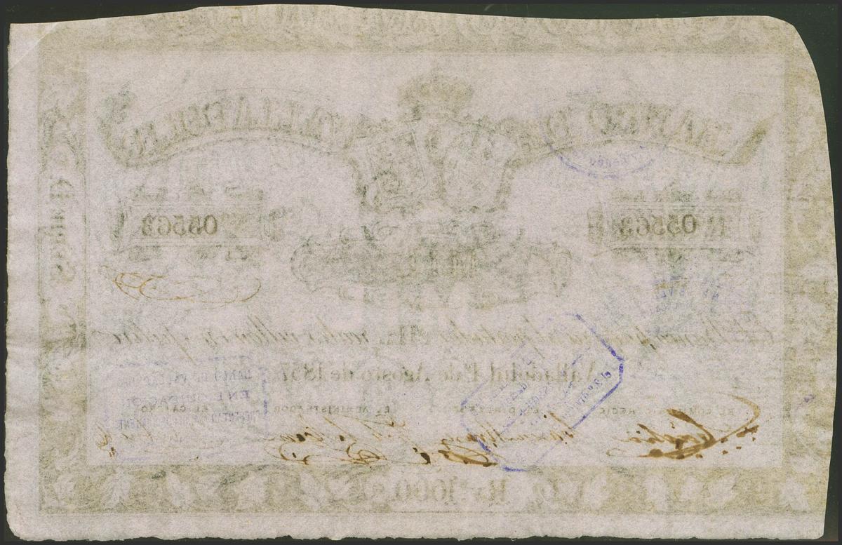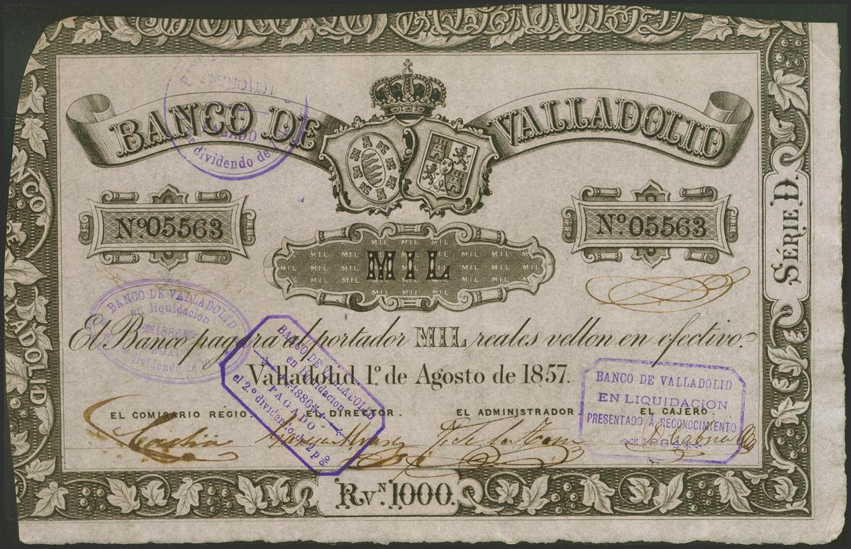 1000 Reales de Vellón. 1 de Agosto de 1857. Banco de Valladolid. Serie D. (Edifil 2017: 134). Muy raro. EBC.