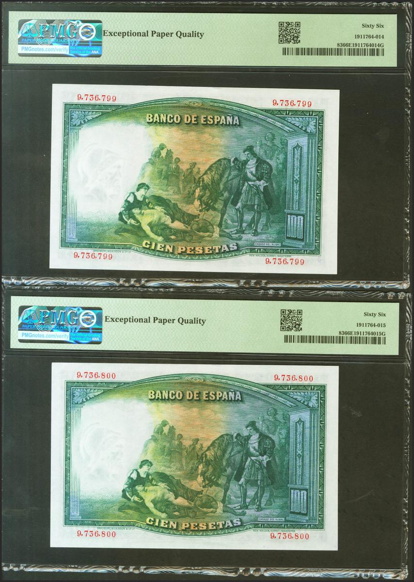 100 Pesetas. 25 de Abril de 1931. Pareja correlativa. Sin serie. (Edifil 2021: 360, Pick: 83). Inusual en esta calidad, apresto original. SC. Encapsulados PMG66EPQ, ambos.