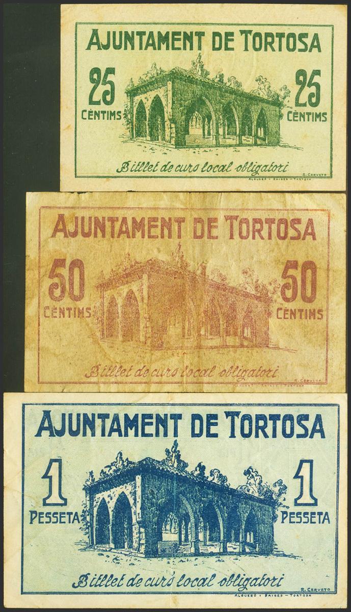 TORTOSA (TARRAGONA). 25 Céntimos, 50 Céntimos y 1 Peseta. 9 de Noviembre de 1937. (González: 10410/12). Serie completa. EBC/MBC.