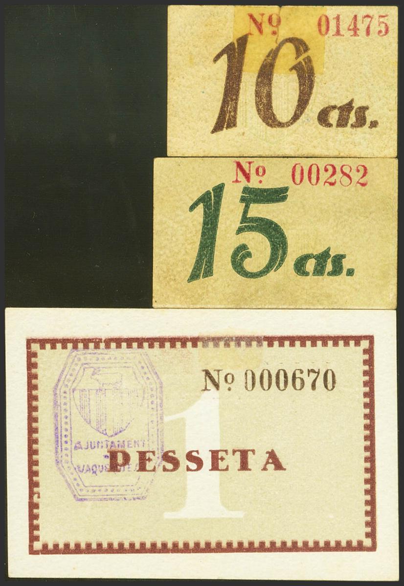 VACARISSES (BARCELONA). 10 Céntimos, 15 Céntimos y 1 Peseta. (1937ca). (González: 10474/76). Inusual serie completa. SC/EBC.