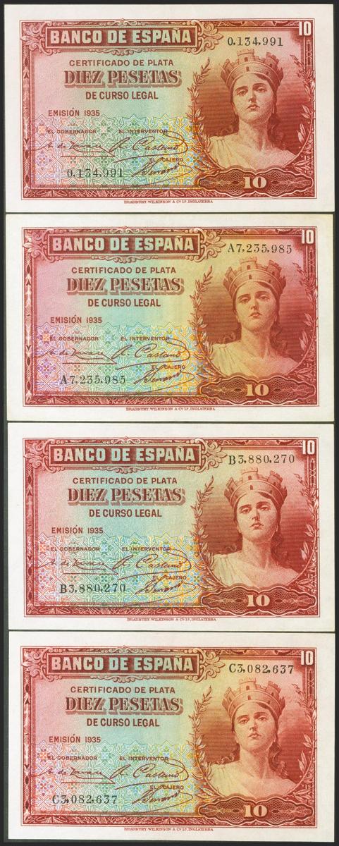 Conjunto de 4 billetes de 10 Pesetas Certificado de Plata emitidos en 1935, sin serie y con las series A, B y C. (Edifil 2021: 364, 364a), conservando su apresto original. EBC++.