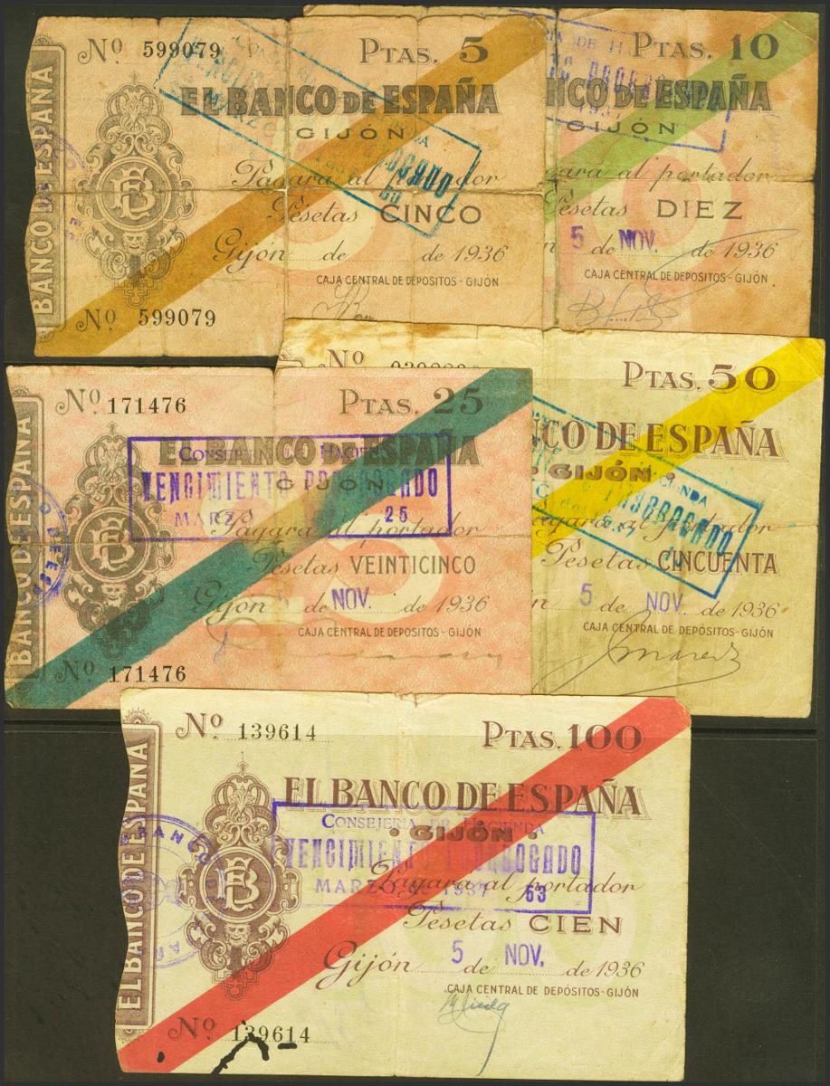 Conjunto de 5 billetes de 5 Pesetas, 10 Pesetas, 25 Pesetas, 50 Pesetas y 100 Pesetas emitidos por la sucursal del Banco de España de Gijón el 5 de Noviembre de 1936. (Edifil 2021: 380/84). MBC-/BC-.