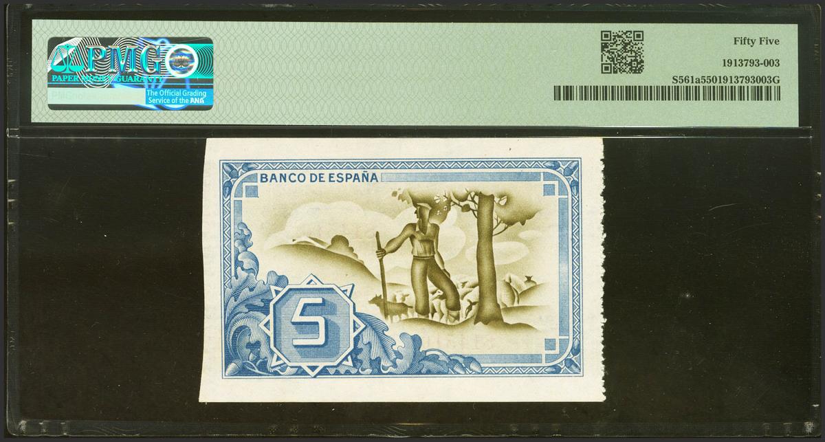 5 Pesetas. 1 de Enero de 1937. Sucursal de Bilbao, antefirma del Banco de Bilbao. Sin serie, con numeración y sin matrices. (Edifil 2021: 385c, Pick: S561a). EBC+. Encapsulado PMG55.