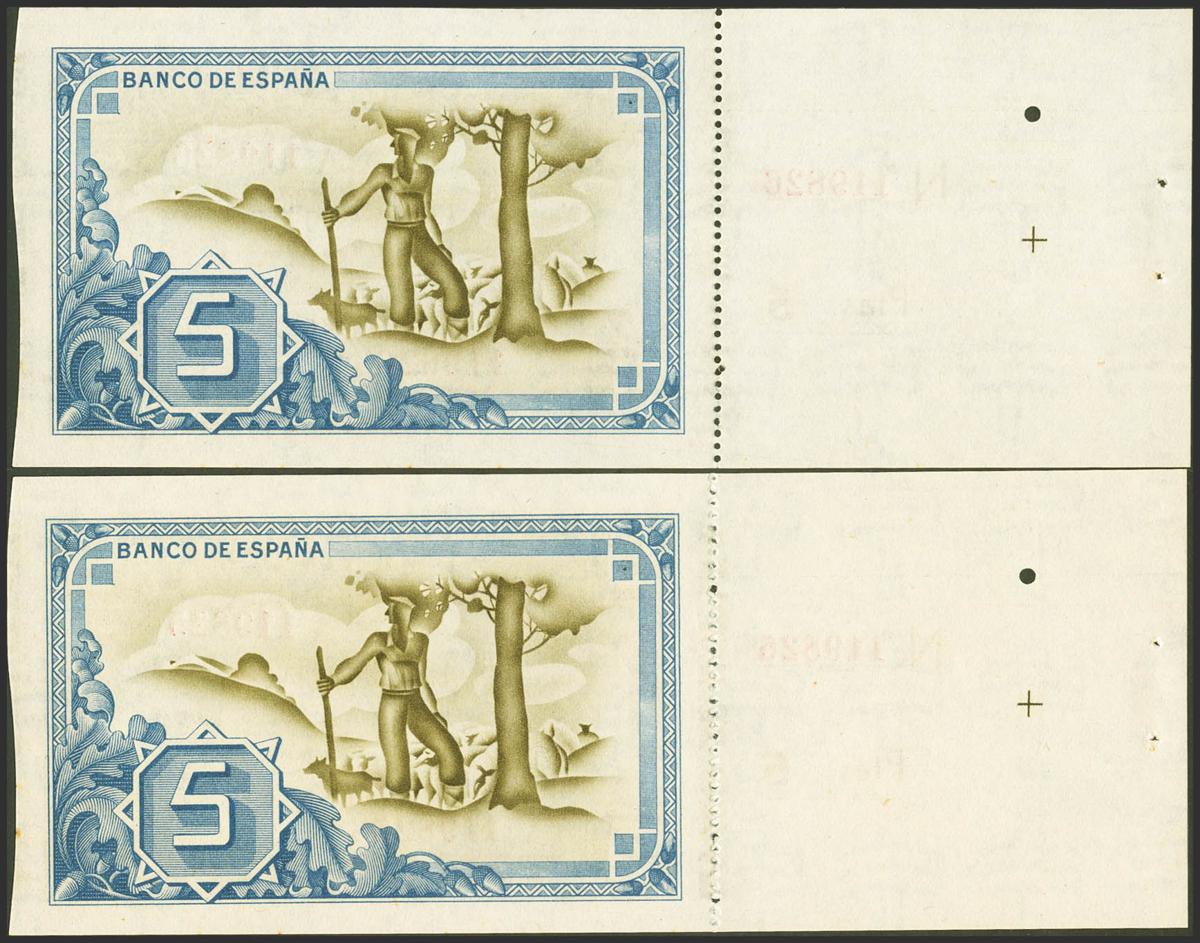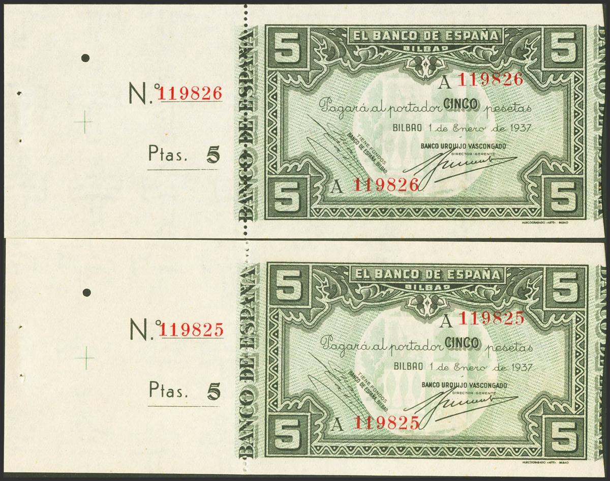 5 Pesetas. 1 de Enero de 1937. Pareja correlativa con serie A y con matriz a la izquierda, con la antefirma de Banco Urquijo Vascongado. (Edifil 2017: 386f). Apresto original. SC.