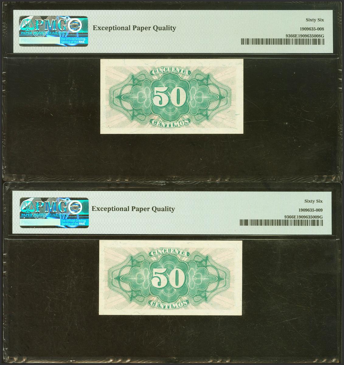 50 Céntimos. 1937. Ministerio de Hacienda. Pareja correlativa. Serie C, última serie emitida. (Edifil 2021: 391a, Pick: 93). Inusual en esta excepcional calidad, apresto original. SC. Encapsulados PMG66EPQ, ambos.