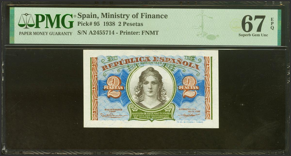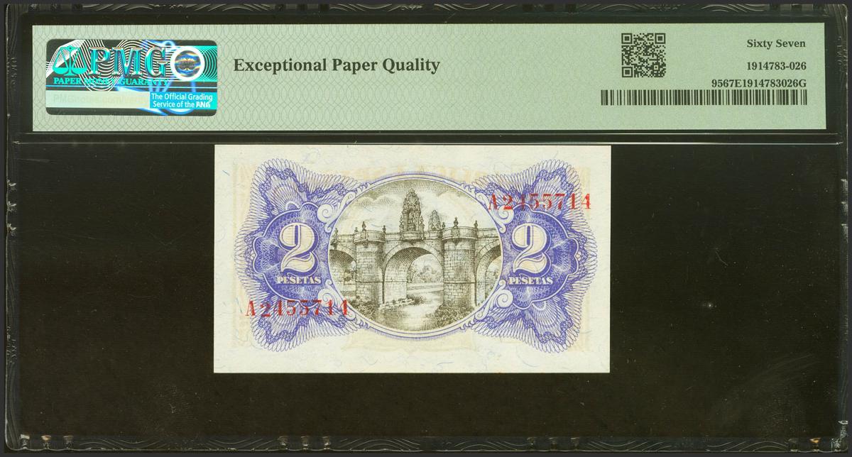 2 Pesetas. 1937. Ministerio de Hacienda. Serie A. (Edifil 2021: 393, Pick: 95). Raro en esta excepcional calidad, apresto original. SC. Encapsulado PMG67EPQ.