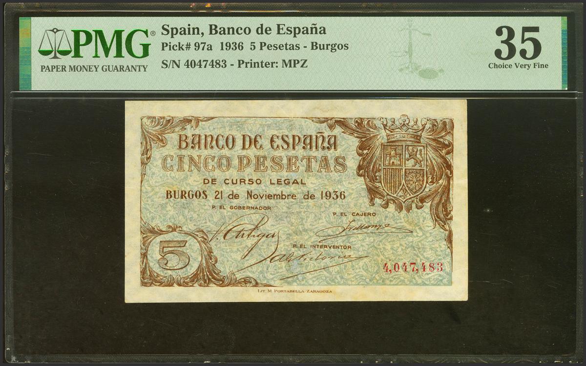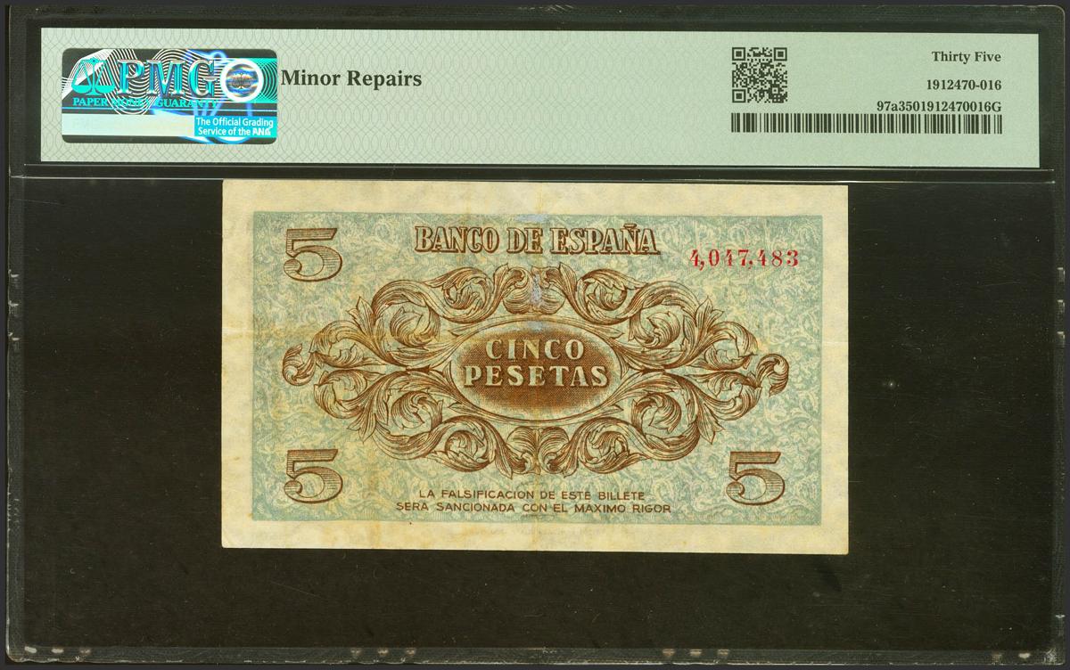 5 Pesetas. 21 de Noviembre de 1936. Sin serie. (Edifil 2021: 417, Pick: 97a). Inusual, mínimamente reparado. MBC+. Encapsulado PMG35.