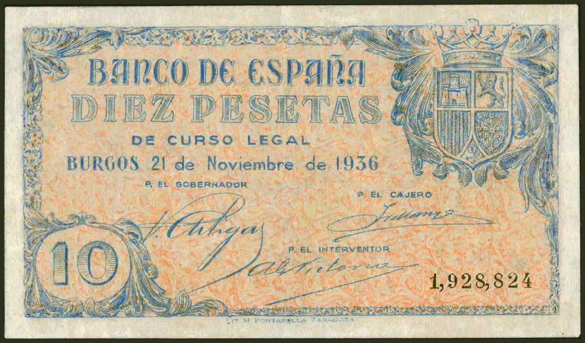 10 Pesetas. 21 de Noviembre de 1936. Sin serie. (Edifil 2021: 418). Inusual, pequeñas reparaciones. MBC-.