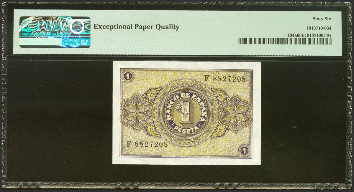 1 Peseta. 12 de Octubre de 1937. Serie F, última serie emitida. (Edifil 2021: 425a, Pick: 104a). Apresto original. SC. Encapsulado PMG66EPQ.