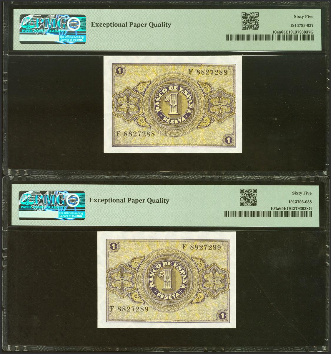1 Peseta. 12 de Octubre de 1937. Pareja correlativa. Serie F, última serie emitida. (Edifil 2021: 425a, Pick: 104a). Apresto original. SC. Encapsulado PMG65EPQ.