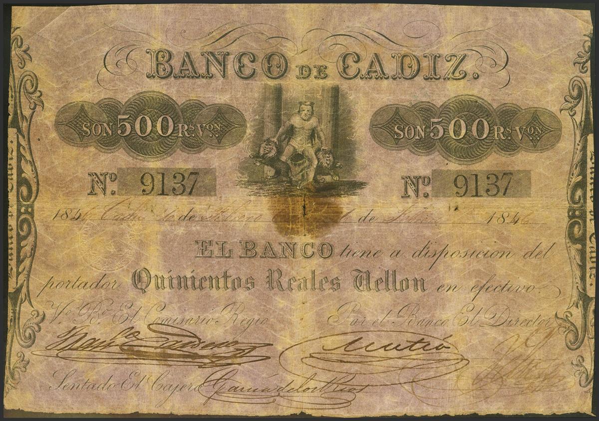 500 Reales. 1 de Febrero de 1846. Emisión I. (Edifil 2021: 72). Habituales erosiones que acompañan a los dobleces. MBC+.