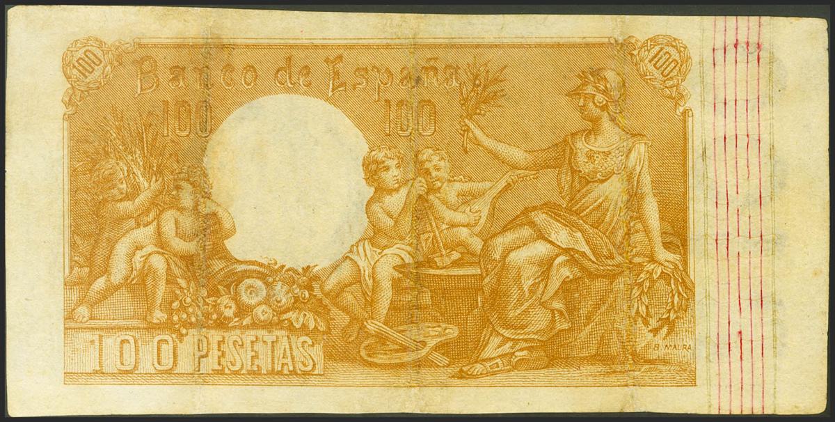 100 Pesetas. 1 de Mayo de 1900. Falso de Epoca. Serie B. (Edifil 2021: 308a, Pick: 51a). Inusual y profesionalmente restaurado, billete con una enorme presencia. MBC-.
