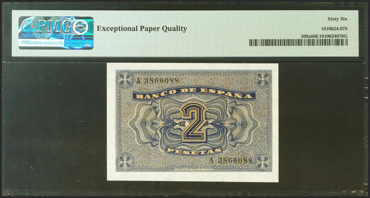 2 Pesetas. 30 de Abril de 1938. Serie A. (Edifil 2021: 429, Pick: 109a). Raro en esta excepcional calidad, apresto original. SC. Encapsulado PMG66EPQ.