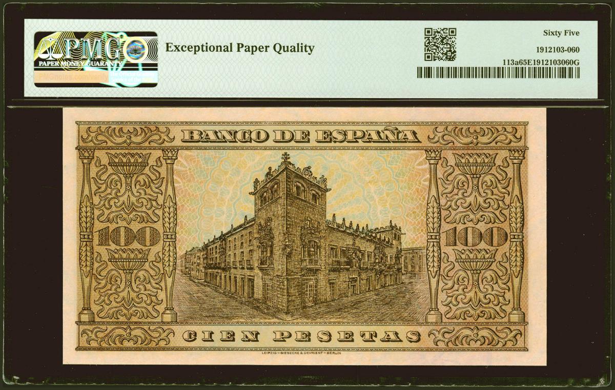 100 Pesetas. 20 de Mayo de 1938. Serie A. (Edifil 2021: 432, Pick: 113a). Rarísimo en esta excepcional calidad, apresto original. SC. Encapsulado PMG65EPQ.