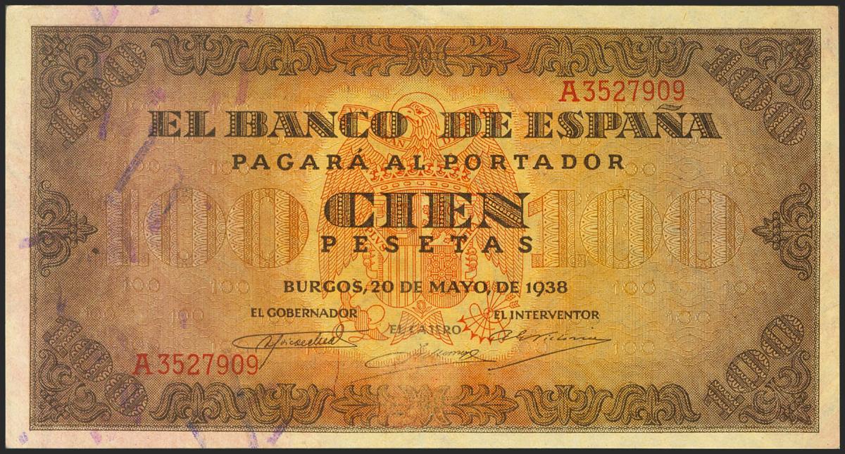100 Pesetas. 20 de Mayo de 1938. Serie A. (Edifil 2021: 432). Conserva gran parte del apresto original. EBC+.