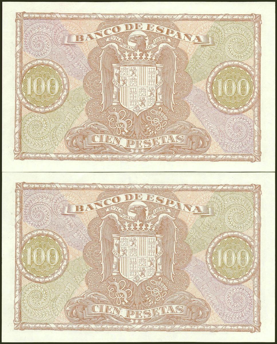 100 Pesetas. 9 de Enero de 1940. Pareja correlativa. Serie H. (Edifil 2021: 438a). Inusual y apresto original. SC-.
