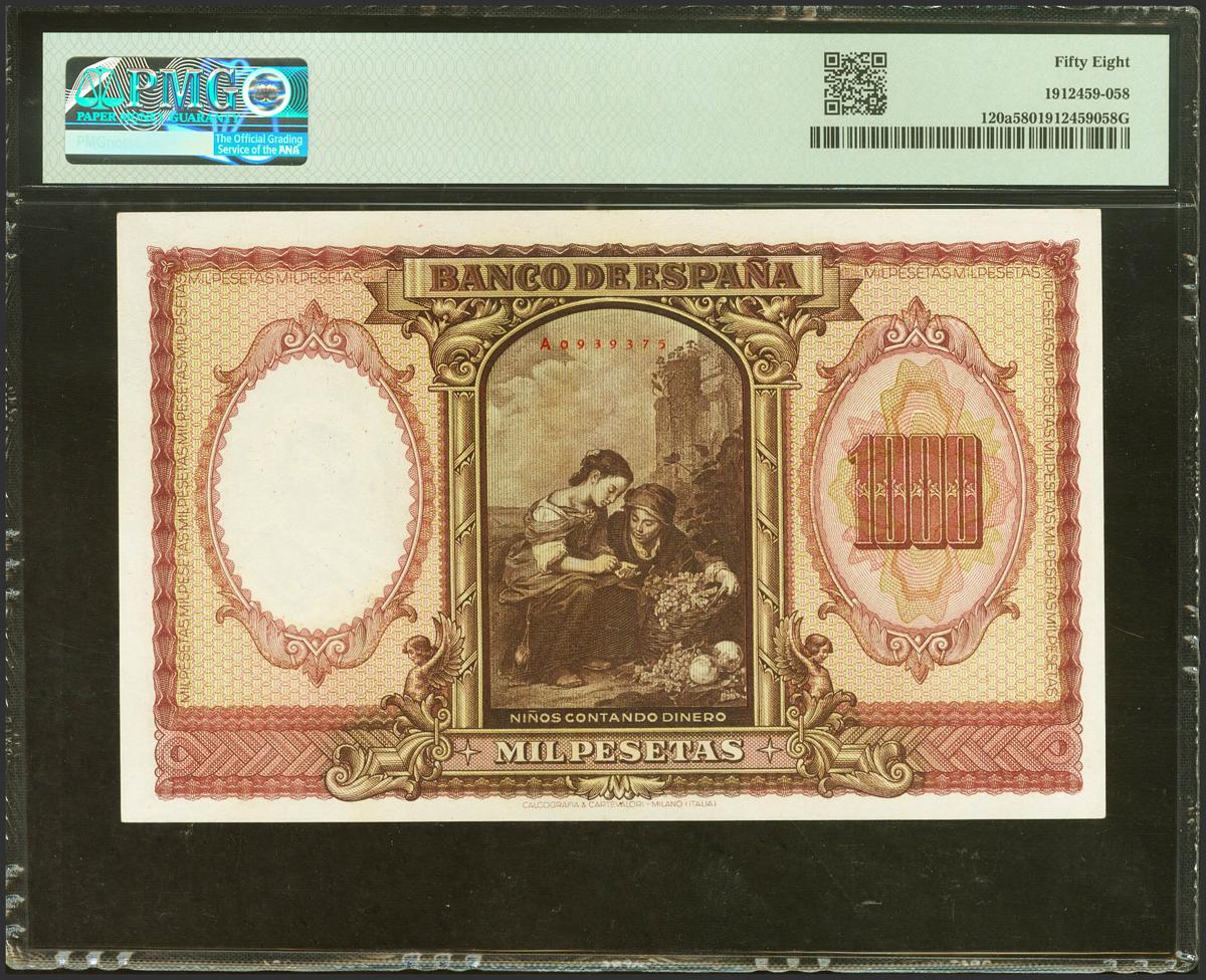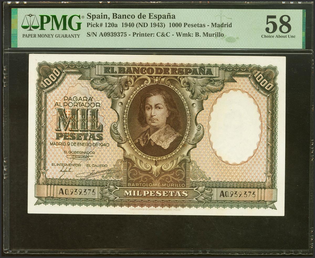 1000 Pesetas. 9 de Enero de 1940. Serie A. (Edifil 2021: 440, Pick: 120a). Raro en esta calidad. EBC++. Encapsulado PMG58.