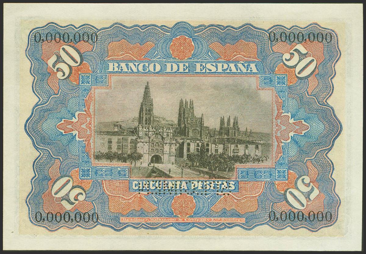 50 Pesetas. 15 de Julio de 1907. Numeración 0,000,000 y taladro SPECIMEN. (Edifil 2021: 319M). Muy raro, especialmente en esta excepcional calidad y apresto original. SC.
