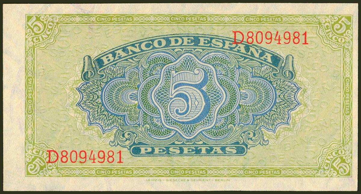 5 Pesetas. 4 de Septiembre de 1940. Serie D. (Edifil 2021: 443a). Conserva todo su apresto original. SC.