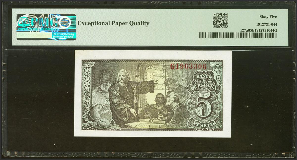 5 Pesetas. 13 de Febrero de 1943. Serie G. (Edifil 2021: 446a, Pick: 127a). Apresto original. SC. Encapsulado PMG65EPQ.
