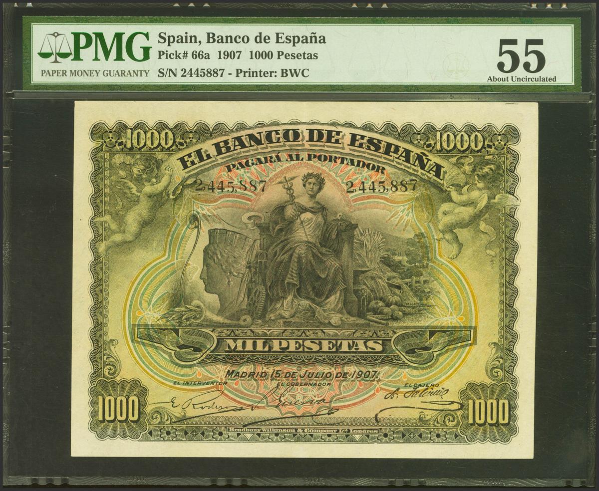 1000 Pesetas. 15 de Julio de 1907. Sin serie. (Edifil 2021: 322, Pick 66a). Rarísimo en esta conservación, sin ninguna reparación. EBC+. Encapsulado PMG55.