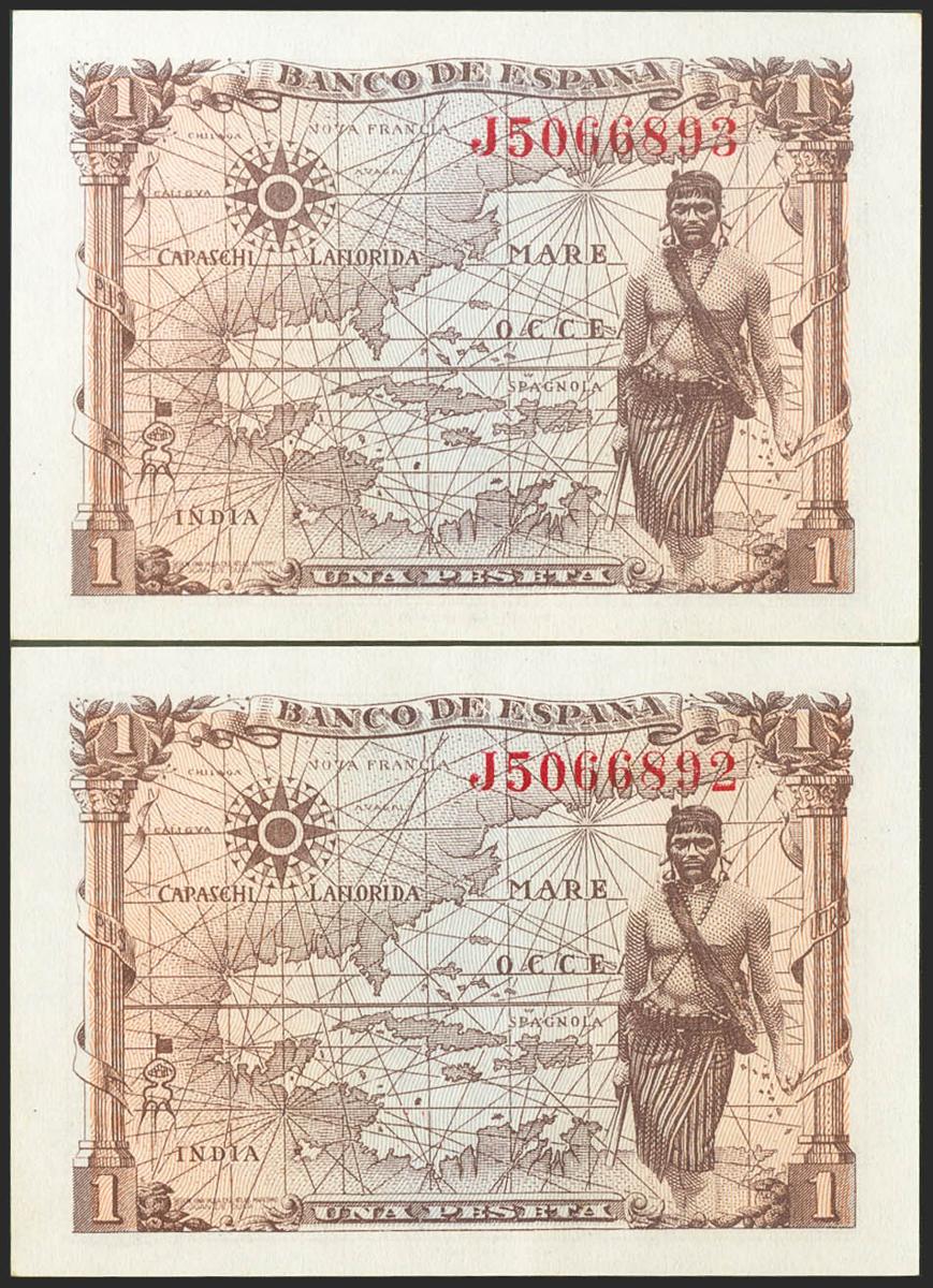 1 Peseta. 15 de Junio de 1945. Pareja correlativa. Serie J. (Edifil 2021: 448a). Conserva gran parte de su apresto original. EBC+.