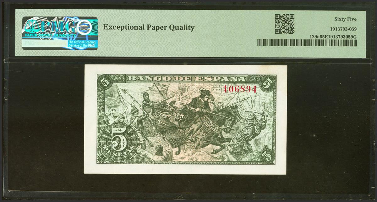 5 Pesetas. 15 de Junio de 1945. Sin serie. (Edifil 2021: 449, Pick: 129a). Raro en esta calidad, apresto original. SC. Encapsulado PMG65EPQ.