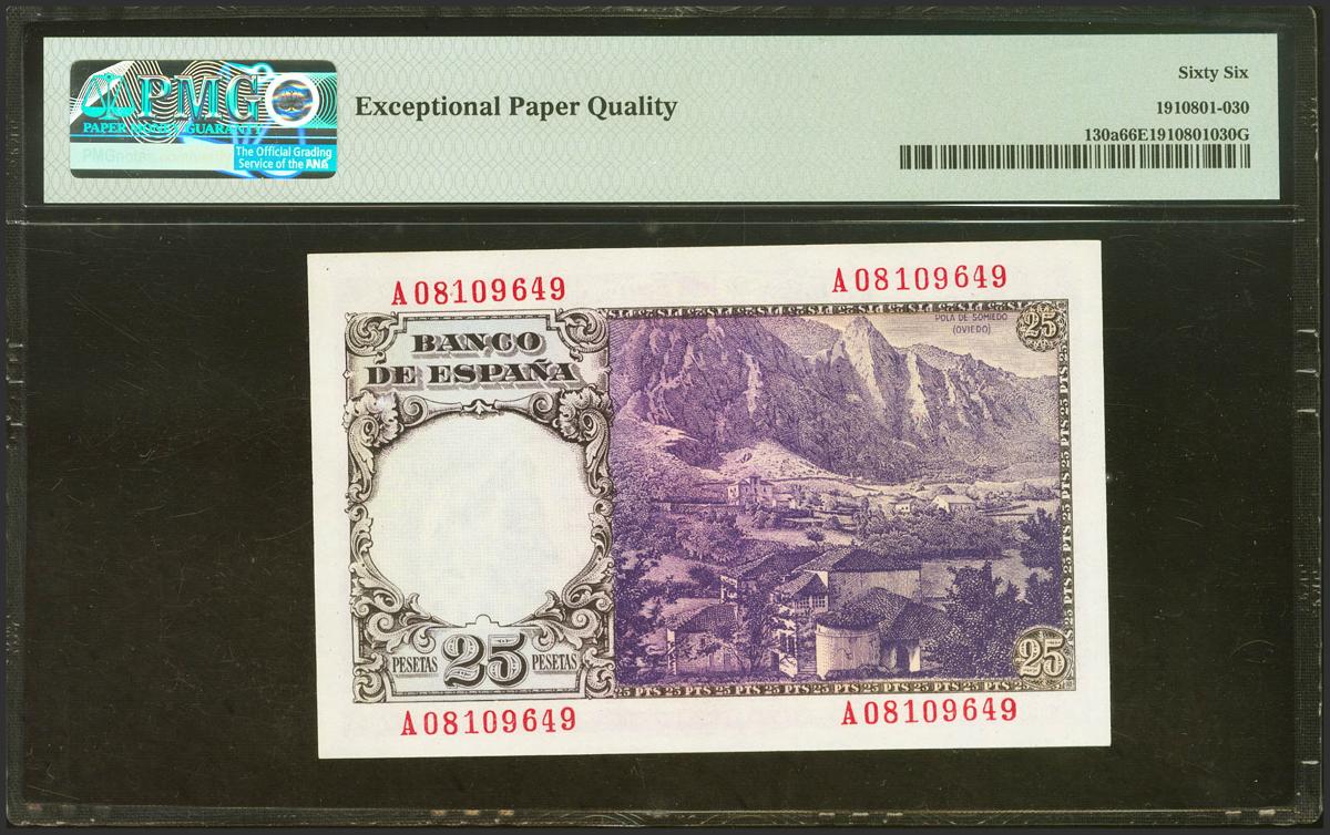 25 Pesetas. 19 de Febrero de 1946. Serie A. (Edifil 2021: 450a, Pick: 130a). Raro en esta excepcional calidad, apresto original. SC. Encapsulado PMG66EPQ.