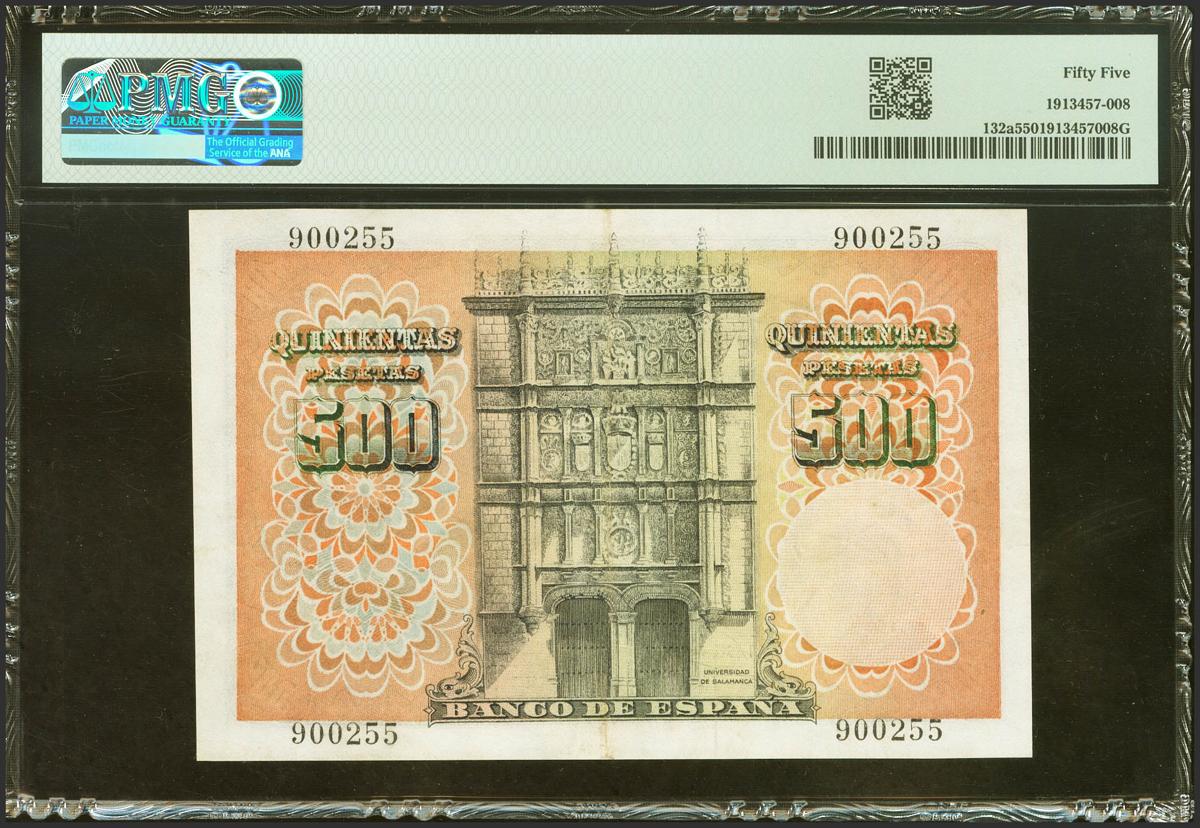 500 Pesetas. 19 de Febrero de 1946. Sin serie. (Edifil 2021: 452, Pick: 132a). Raro en esta conservación. EBC+. Encapsulado PMG55.