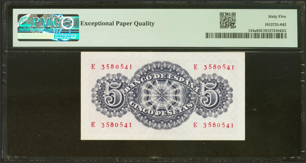 5 Pesetas. 12 de Abril de 1947. Serie E, última serie emitida. (Edifil 2021: 454a, Pick: 134a). Apresto original. SC. Encapsulado PMG65EPQ.