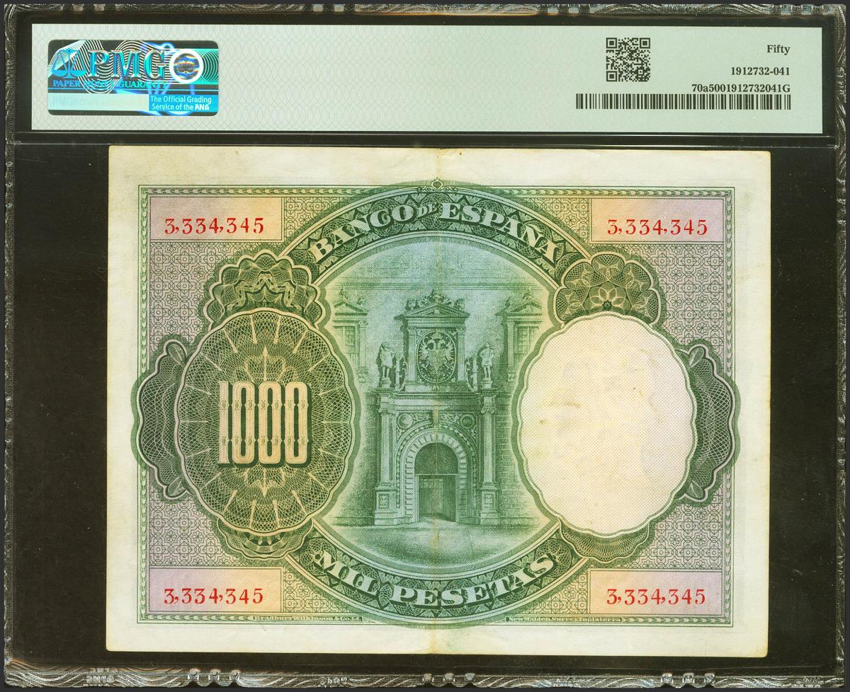 1000 Pesetas. 1 de Julio de 1925. Sin serie y numeración anterior a 3646000 (esta numeración es más rara, especialmente en estas calidades). (Edifil 2021: 324, Pick: 70c). Muy raro en esta calidad. EBC. Encapsulado PMG50.